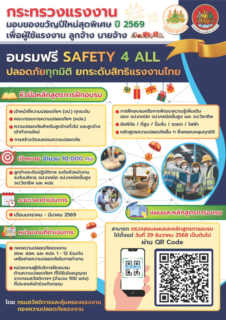 ขวัญปีใหม่สุดพิเศษ ปี 2569 เพื่อผู้ใช้แรงงาน ลูกจ้าง นายจ้าง อบรมฟรี SAFETY 4 ALL ปลอดภัยทุกมิติ ยกระดับสิทธิแรงงานไทย