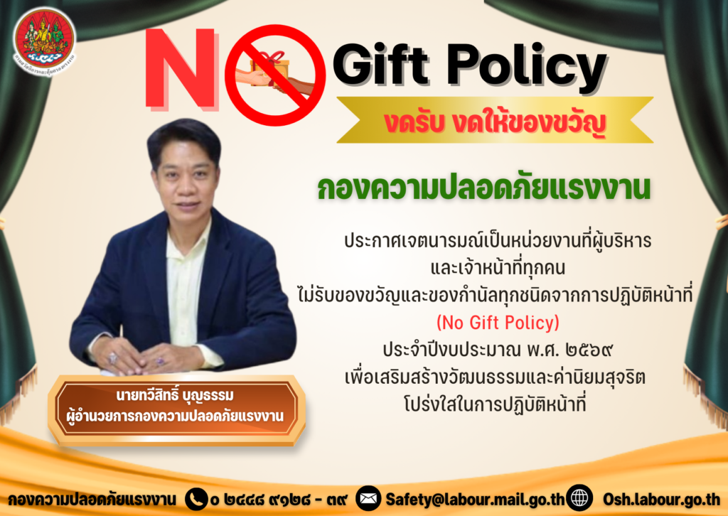 ประกาศเจตนารมณ์เป็นหน่วยงานที่ผู้บริหารและเจ้าหน้าที่ทุกคนไม่รับของขวัญและของกำนัลทุกชนิดจากการปฏิบัติหน้าที่ (NO GIFT POLICY) ประจำปีงบประมาณ พ.ศ. ๒๕๖๙
