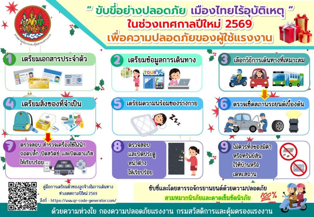 กรมสวัสดิการและคุ้มครองแรงาน โดยกองความปลอดภัยแรงงาน ประชาสัมพันธ์ การรณรงค์ “ขับขี่ปลอดภัย เมืองไทยไร้อุบัติเหตุ” ช่วงเทศกาลปีใหม่ 2569 เพื่อความปลอดภัยของผู้ใช้แรงงาน