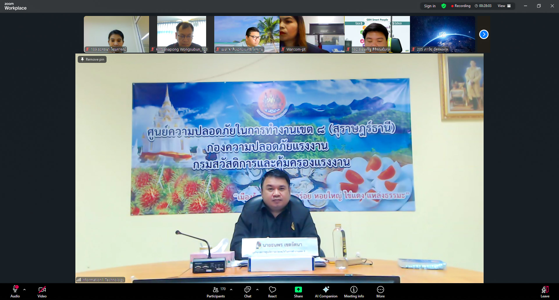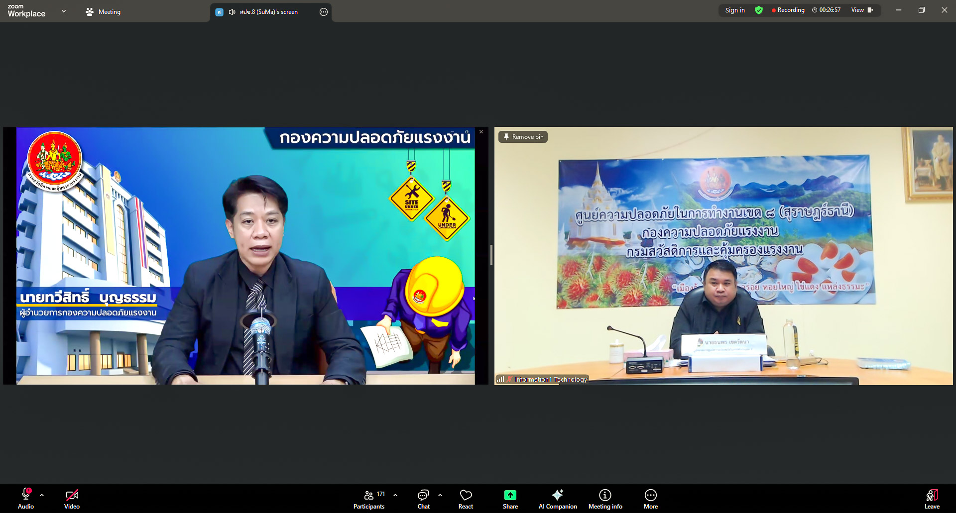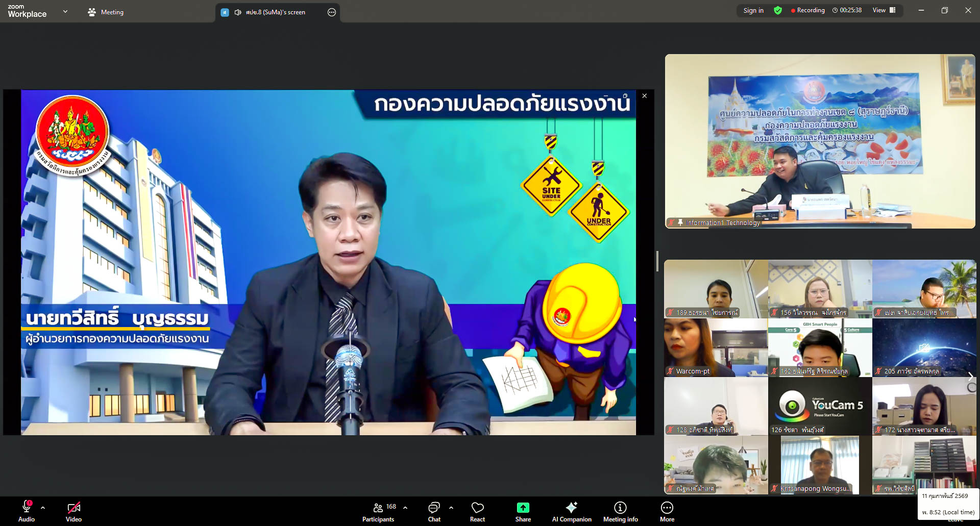 วันพุธที่ ๑๑ กุมภาพันธ์ ๒๕๖๙ เวลา ๐๘.๔๕ น. นายทวีสิทธิ์ บุญธรรม ผู้อำนวยการกองความปลอดภัยแรงงาน เป็นประธานเปิดการอบรมโครงการประชุมชี้แจงกฎหมาย แนวปฏิบัติ และมาตรการเชิงป้องกันด้านความปลอดภัยฯ สำหรับนายจ้าง ลูกจ้าง และประชาชนทั่วไป ประจำปีงบประมาณ พ.ศ. ๒๕๖๙ ผ่านระบบวีดิทัศน์ทางไกล จัดโดยศูนย์ความปลอดภัยในการทำงานเขต ๘ (สุราษฎร์ธานี) มีผู้เข้าร่วมโครงการ ๑๕๐ คน