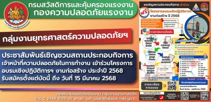 เชิญชวน สถานประกอบกิจการ เจ้าหน้าที่ความปลอดภัยฯ เข้าร่วมโครงการอบรมเชิงปฏิบัติการฯ งานก่อสร้าง ประจำปี 2568