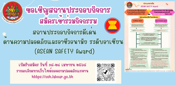 ขอเชิญสถานประกอบกิจการสมัครเข้าร่วมกิจกรรมสถานประกอบกิจการดีเด่นด้านความปลอดภัยและอาชีวอนามัย ระดับอาเซียน (ASEAN SAFETY Award 2025)