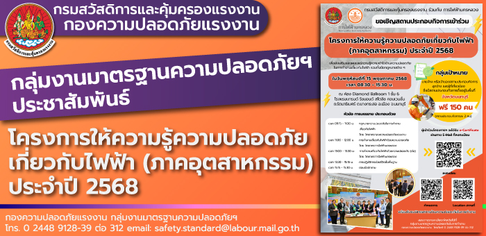 ขอเชิญ นายจ้าง/เจ้าของสถานประกอบกิจการ และผู้เกี่ยวข้อง ในพื้นที่จังหวัดนนทบุรี เข้าร่วมงานโครงการให้ความรู้ความปลอดภัยเกี่ยวกับไฟฟ้า (ภาคอุตสาหกรรม) ประจำปี 2568