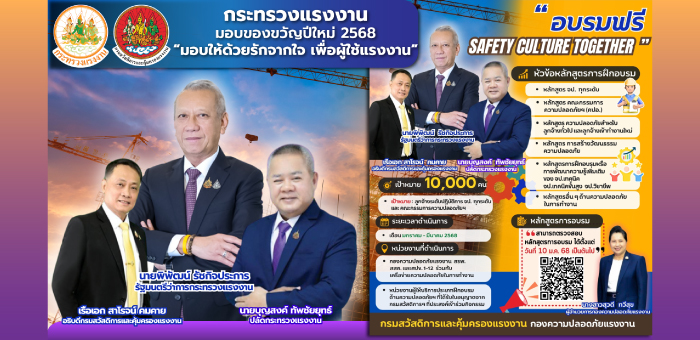 กระทรวงแรงงาน กรมสวัสดิการและคุ้มครองแรงงาน มอบของขวัญปีใหม่ ๒๕๖๘ “มอบให้ด้วยรักจากใจ เพื่อผู้ใช้แรงงาน” อบรมฟรี SAFETY CULTURE TOGETHER