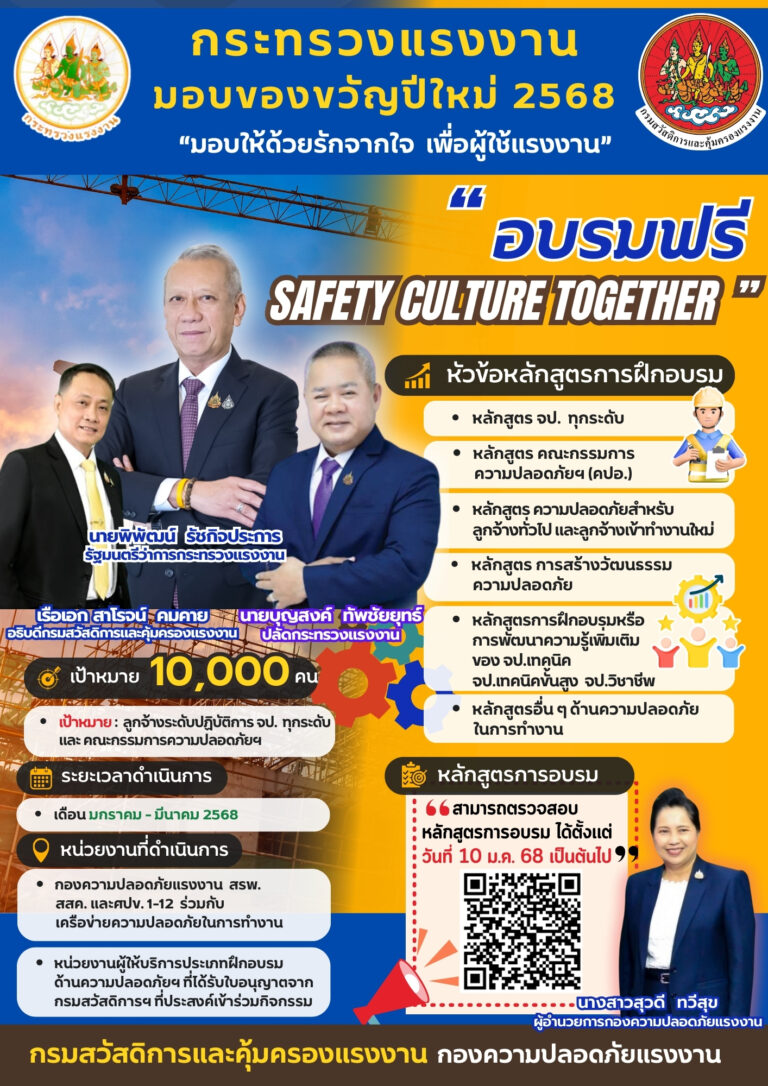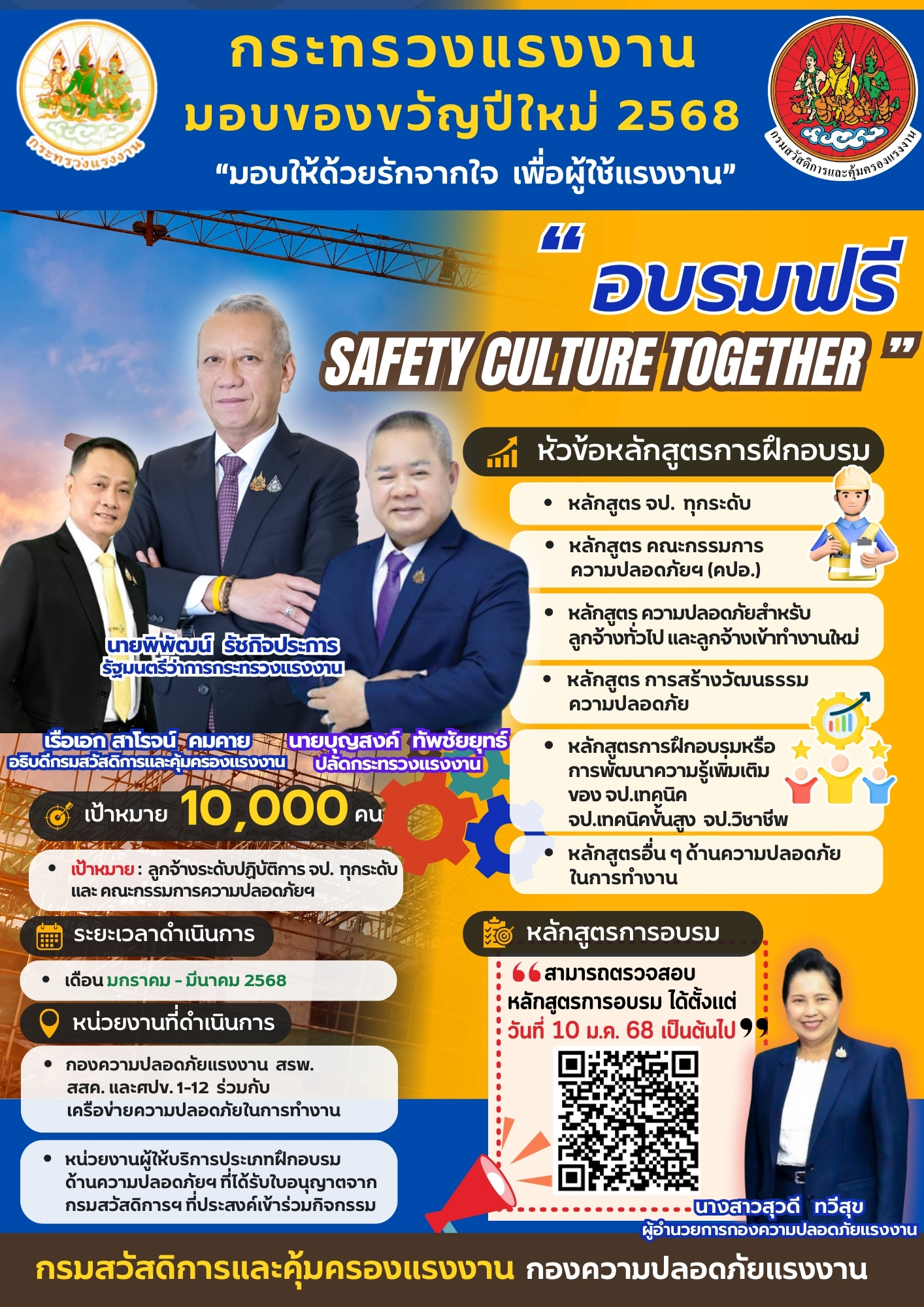 กระทรวงแรงงาน กรมสวัสดิการและคุ้มครองแรงงาน มอบของขวัญปีใหม่ ๒๕๖๘ “มอบให้ด้วยรักจากใจ เพื่อผู้ใช้แรงงาน” อบรมฟรี SAFETY CULTURE TOGETHER