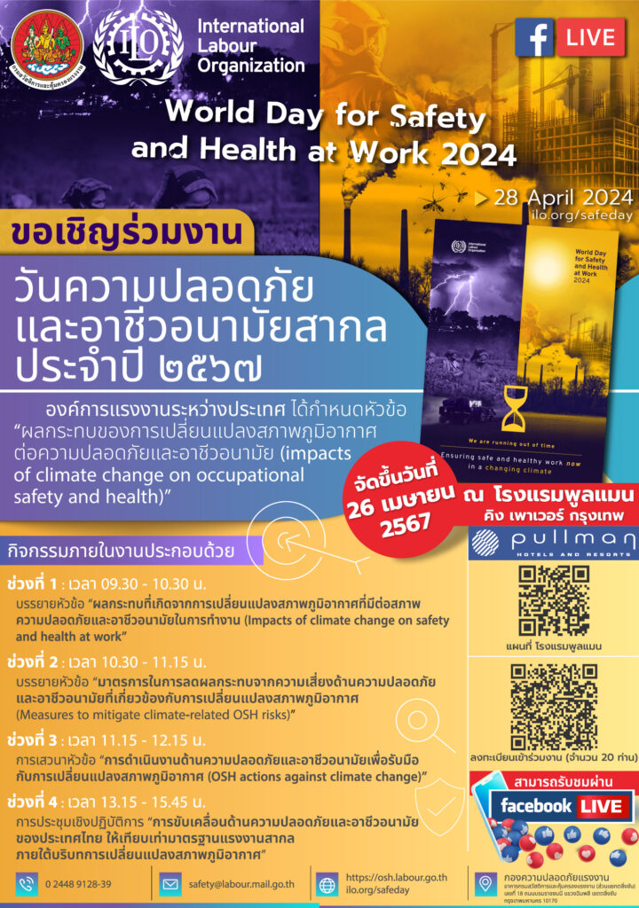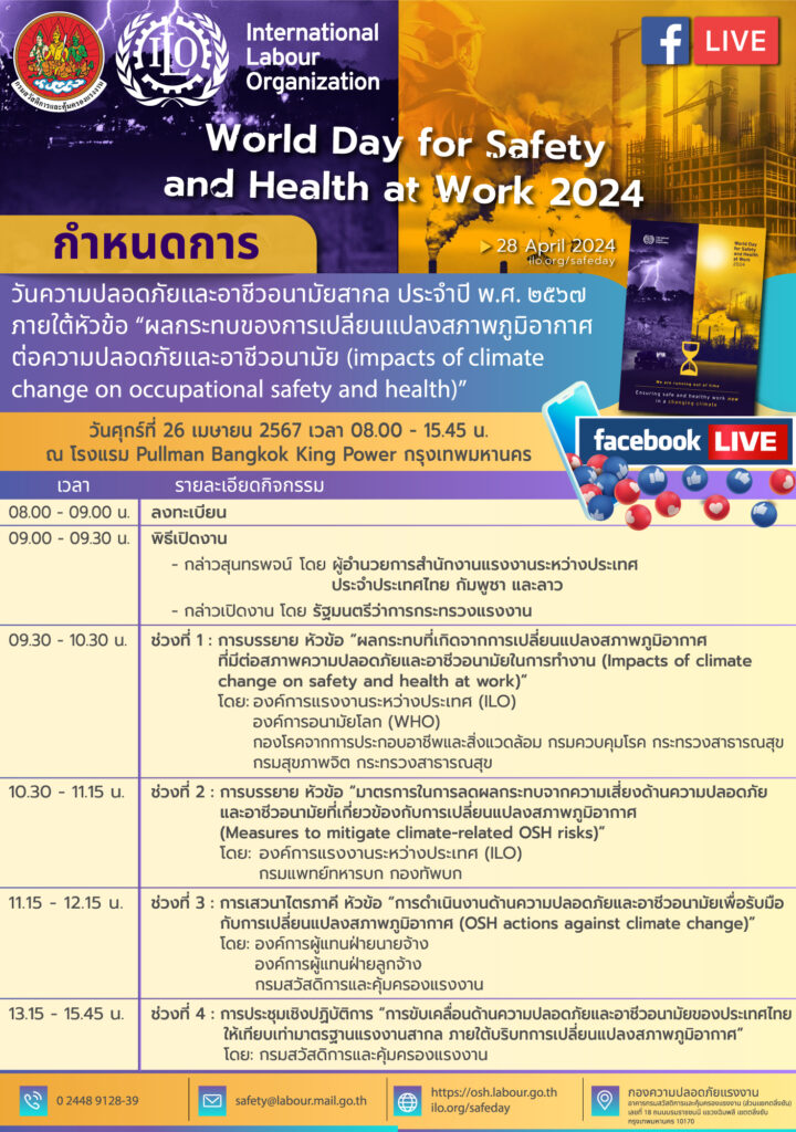 ที่ผ่านมา ประเทศไทยในฐานะประเทศสมาชิกขององค์การแรงงานระหว่างประเทศ (ILO) ได้จัดงานวันความปลอดภัยและอาชีวอนามัยสากลอย่างต่อเนื่องเป็นประจำทุกปี และในปีนี้ กรมสวัสดิการและคุ้มครองแรงงาน โดยกองความปลอดภัยแรงงาน ได้กำหนดจัดงานวันความปลอดภัยและอาชีวอนามัยสากล ประจำปี พ.ศ. ๒๕๖๗ หรือ Safe Day 2024 ภายใต้บริบทของการเปลี่ยนแปลงสภาพภูมิอากาศ เพื่อสร้างความตระหนักรู้แก่ทุกภาคส่วนที่มีความเกี่ยวข้องกับอันตรายที่เกิดจากการเปลี่ยนแปลงสภาพภูมิอากาศ รวมทั้งมาตรการป้องกันด้านความปลอดภัยและอาชีวอนามัย