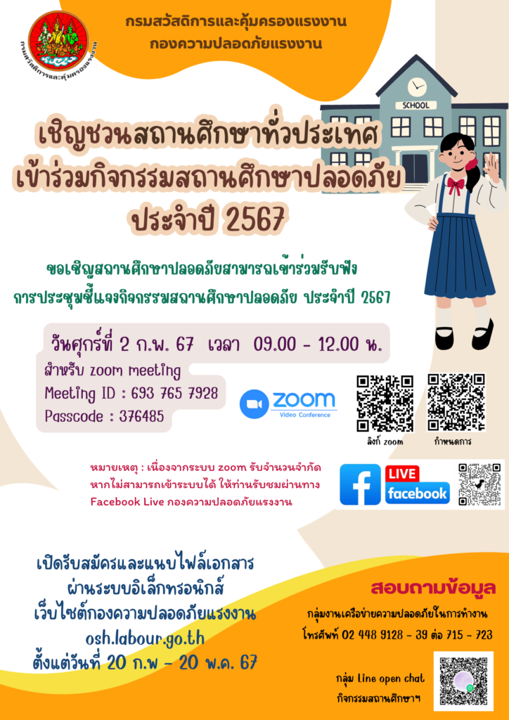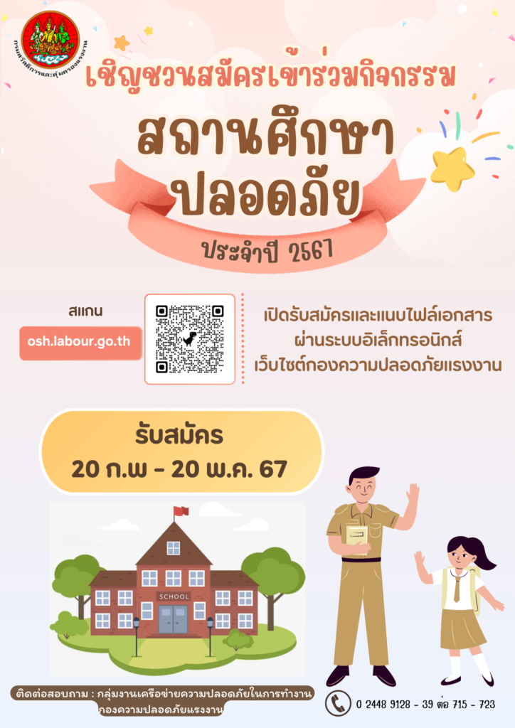 กรมสวัสดิการและคุ้มครองแรงงาน กองความปลอดภัยแรงงาน โดยกลุ่มงานเครือข่ายความปลอดภัยในการทำงาน ประชาสัมพันธ์การชี้แจงกิจกรรมสถานศึกษาปลอดภัย ประจำปี พ.ศ. ๒๕๖๗ ในวันศุกร์ที่ ๒ กุมภาพันธ์ ๒๕๖๗ ผ่านระบบ Zoom Meeting และ Facebook LIVE และกำหนดการ เปิดรับสมัครกิจกรรมสถานศึกษาปลอดภัย ประจำปี พ.ศ. ๒๕๖๗ ระหว่างวันที่ ๒๐ กุมภาพันธ์ – ๒๐ พฤษภาคม ๒๕๖๗ ผ่านระบบอิเล็กทรอนิกส์