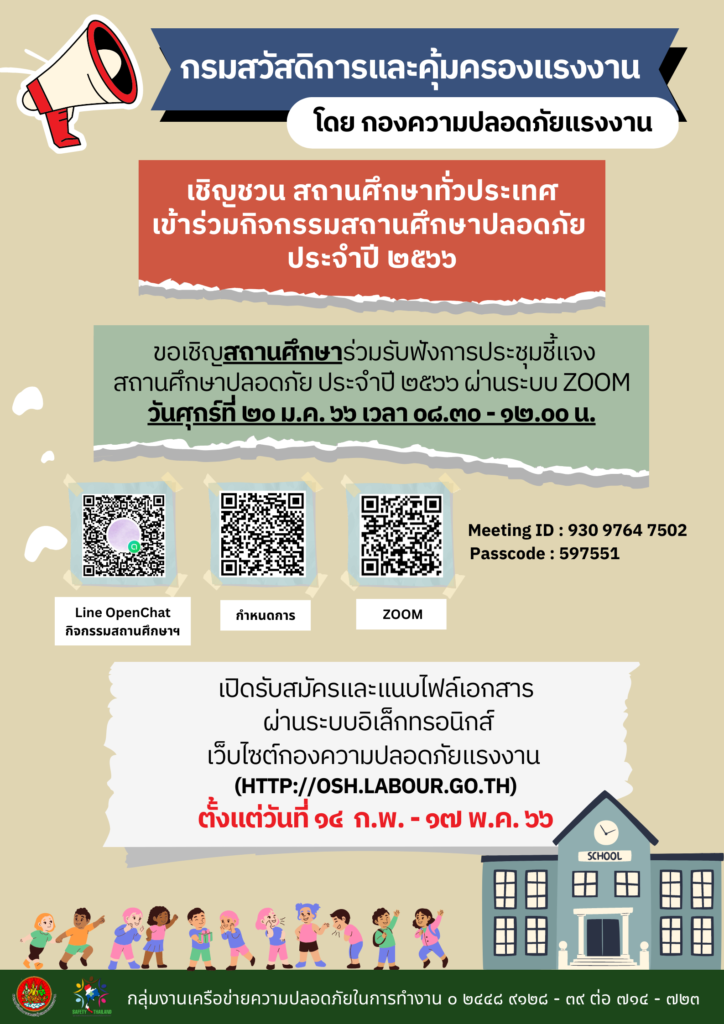 กรมสวัสดิการและคุ้มครองแรงงาน โดยกองความปลอดภัยแรงงาน ขอเชิญสถานศึกษาทั่วประเทศ เข้าร่วมรับฟังการประชุมชี้แจงการเข้าร่วมกิจกรรมสถานศึกษาปลอดภัย ประจำปี 2566 ผ่านระบบ zoom Meeting ในวันศุกร์ที่ 20 มกราคม 2566 เวลา 08.30 – 12.00 น. Meeting ID: 930 9764 7502 Passcode: 597551 และเปิดรับสมัครและยื่นเอกสารผ่านระบบอิเล็กทรอนิกส์ โดยติดตามได้ที่ เว็บไซต์กองความปลอดภัยแรงงาน http://osh.labour.go.th ตั้งแต่วันที่ 14 กุมภาพันธ์ – 17 พฤษภาคม 2566