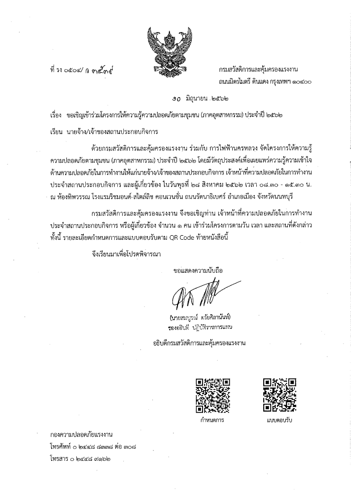 ขอเชิญเข้าร่วมโครงการให้ความรู้ความปลอดภัยตามชุมชน (ภาคอุตสาหกรรม) ประจำปี ๒๕๖๒