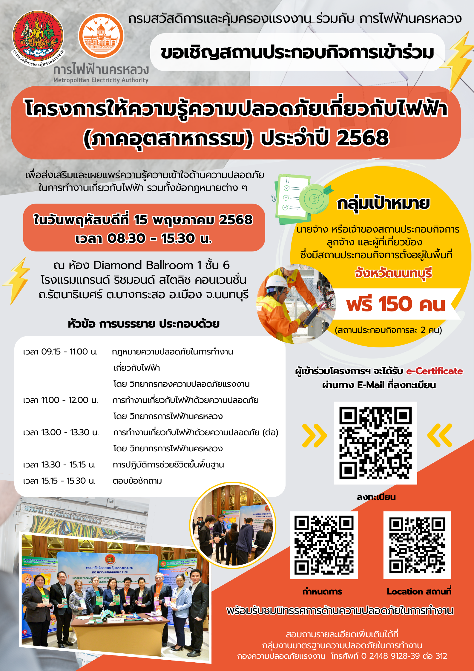 กรมสวัสดิการและคุ้มครองแรงงาน ร่วมกับ การไฟฟ้านครหลวง ขอเชิญ นายจ้าง/เจ้าของสถานประกอบกิจการ และผู้เกี่ยวข้อง ในพื้นที่จังหวัดนนทบุรี เข้าร่วมงานโครงการให้ความรู้ความปลอดภัยเกี่ยวกับไฟฟ้า (ภาคอุตสาหกรรม) ประจำปี 2568