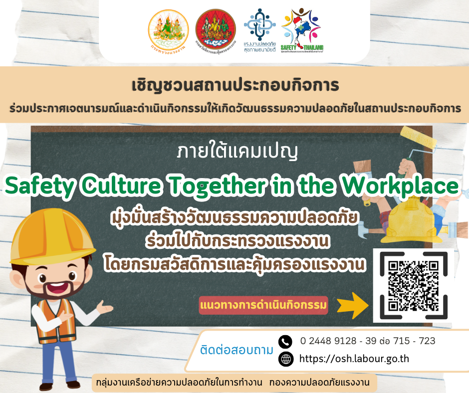 เชิญชวนสถานประกอบกิจการร่วมประกาศเจตนารมณ์และดำเนินกิจกรรมให้เกิดวัฒนธรรมความปลอดภัยในสถานประกอบกิจการ