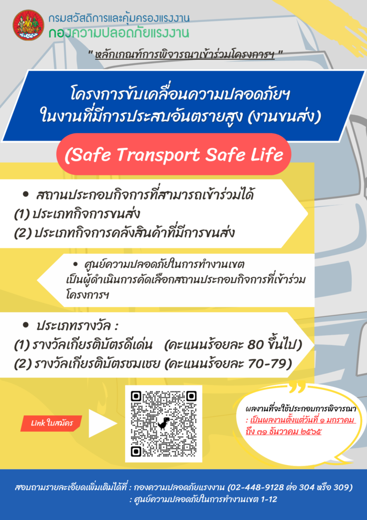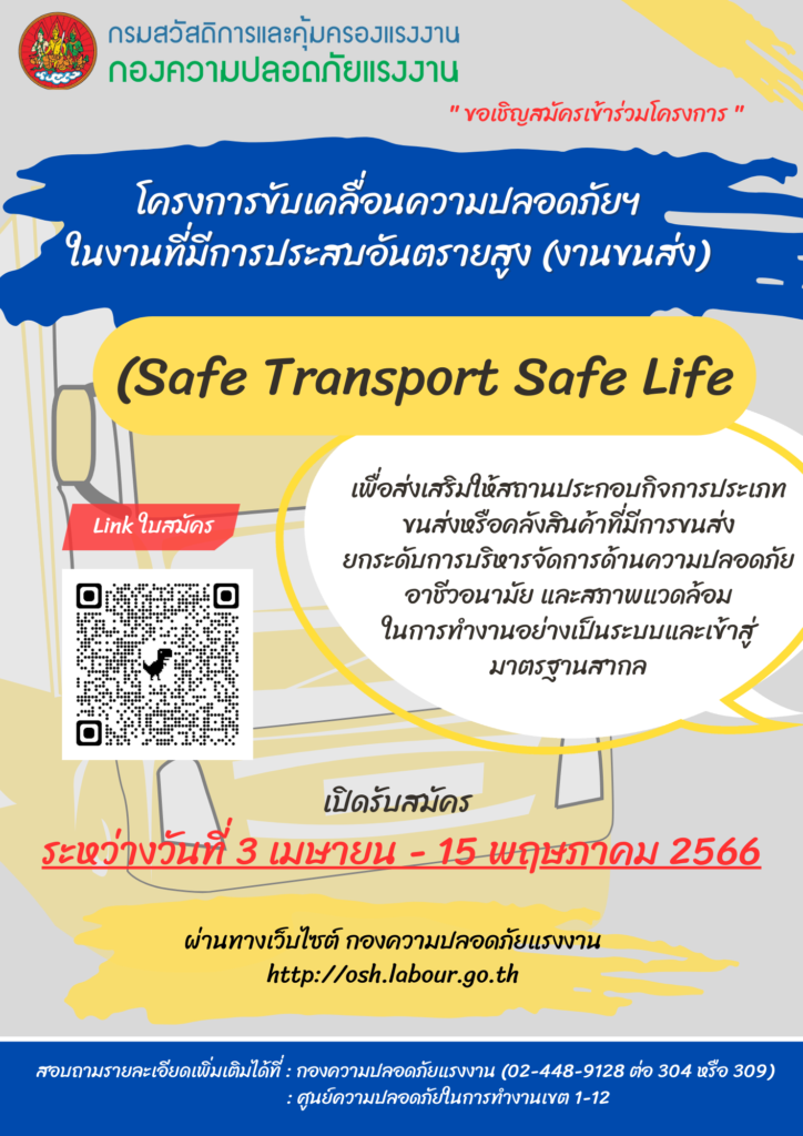 กรมสวัสดิการและคุ้มครองแรงงาน โดยกองความปลอดภัยแรงงาน เชิญชวนสถานประกอบกิจการประเภทขนส่งหรือคลังสินค้าเข้าร่วมโครงการขับเคลื่อนความปลอดภัย อาชีวอนามัย และสถาพแวดล้อมในการทำงาน ในงานที่มีการประสบอันตรายสูง (งานขนส่ง) (Safe Transport Safe Life) ประจำปี ๒๕๖๖ เพื่อส่งเสริมให้สถานประกอบกิจการประเภทขนส่งหรือคลังสินค้าที่มีการขนส่ง ยกระดับการบริหารจัดการด้านความปลอดภัย อาชีวอนามัย และสภาพแวดล้อมในการทำงาน อย่างเป็นระบบและเข้าสู่มาตรฐานสากล