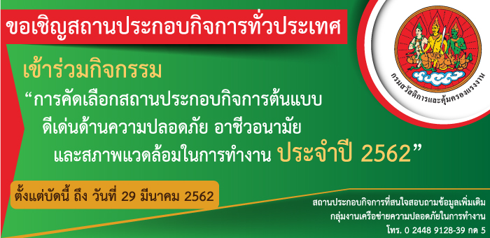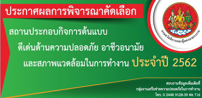 ประกาศผลการพิจารณาคัดเลือก สถานประกอบกิจการต้นแบบดีเด่นด้านความปลอดภัย อาชีวอนามัย และสภาพแวดล้อมในการทำงาน ประจำปี ๒๕๖๒