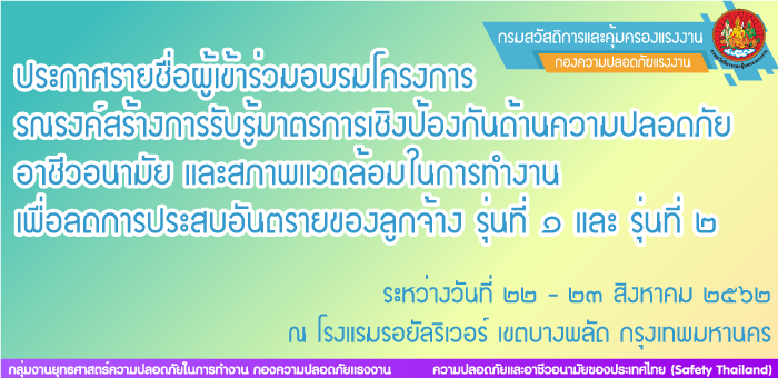 ประกาศรายชื่อผู้เข้าร่วมอบรมโครงการรณรงค์สร้างการรับรู้มาตรการเชิงป้องกันด้านความปลอดภัย อาชีวอนามัย และสภาพแวดล้อมในการทำงาน เพื่อลดการประสบอันตรายของลูกจ้าง รุ่นที่ ๑ และรุ่นที่ ๒