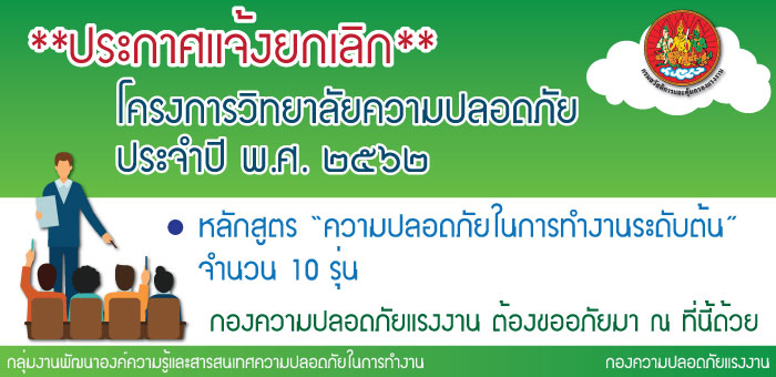 โครงการวิทยาลัยความปลอดภัย ประจำปี พ.ศ. ๒๕๖๒ หลักสูตร “ความปลอดภัยในการทำงานระดับต้น” ***ยกเลิก***