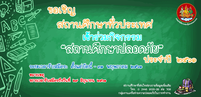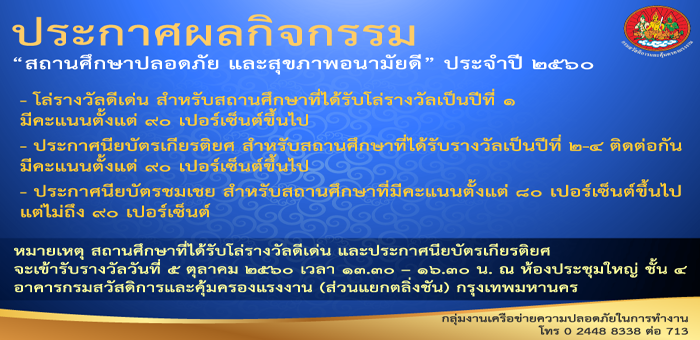 ประกาศผล กิจกรรม “สถานศึกษาปลอดภัย และสุขภาพอนามัยดี” ประจำปี ๒๕๖๐
