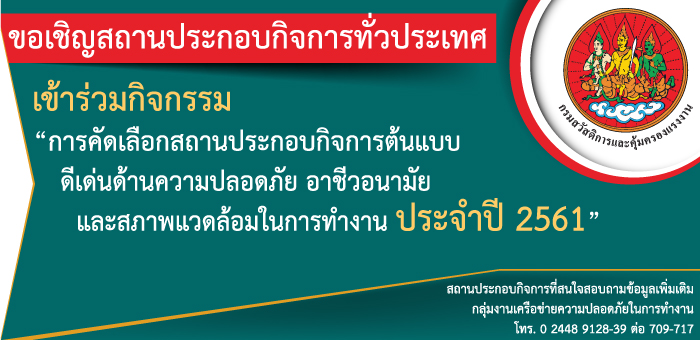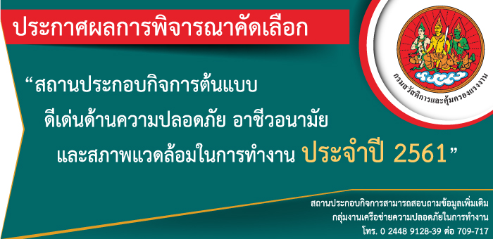ประกาศผลการพิจารณาคัดเลือก สถานประกอบกิจการต้นแบบดีเด่นด้านความปลอดภัย อาชีวอนามัย และสภาพแวดล้อมในการทำงาน ประจำปี ๒๕๖๑