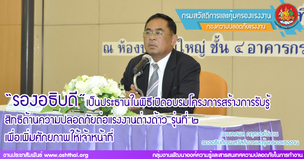 รองอธิบดี เป็นประธานในพิธีเปิดอบรมโครงการสร้างการรับรู้ สิทธิด้านความปลอดภัยต่อแรงงานต่างด้าว รุ่นที่ ๒ เพื่อเพิ่มศักยภาพให้เจ้าหน้าที่