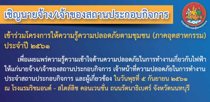 เชิญสถานประกอบกิจการเข้าร่วมโครงการให้ความรู้ความปลอดภัยตามชุมชน (ภาคอุตสาหกรรม) ประจำปี ๒๕๖๑