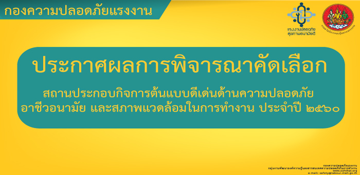 ประกาศผลการพิจารณาคัดเลือก สถานประกอบกิจการต้นแบบดีเด่นด้านความปลอดภัย อาชีวอนามัย และสภาพแวดล้อมในการทำงาน ประจำปี ๒๕๖๐