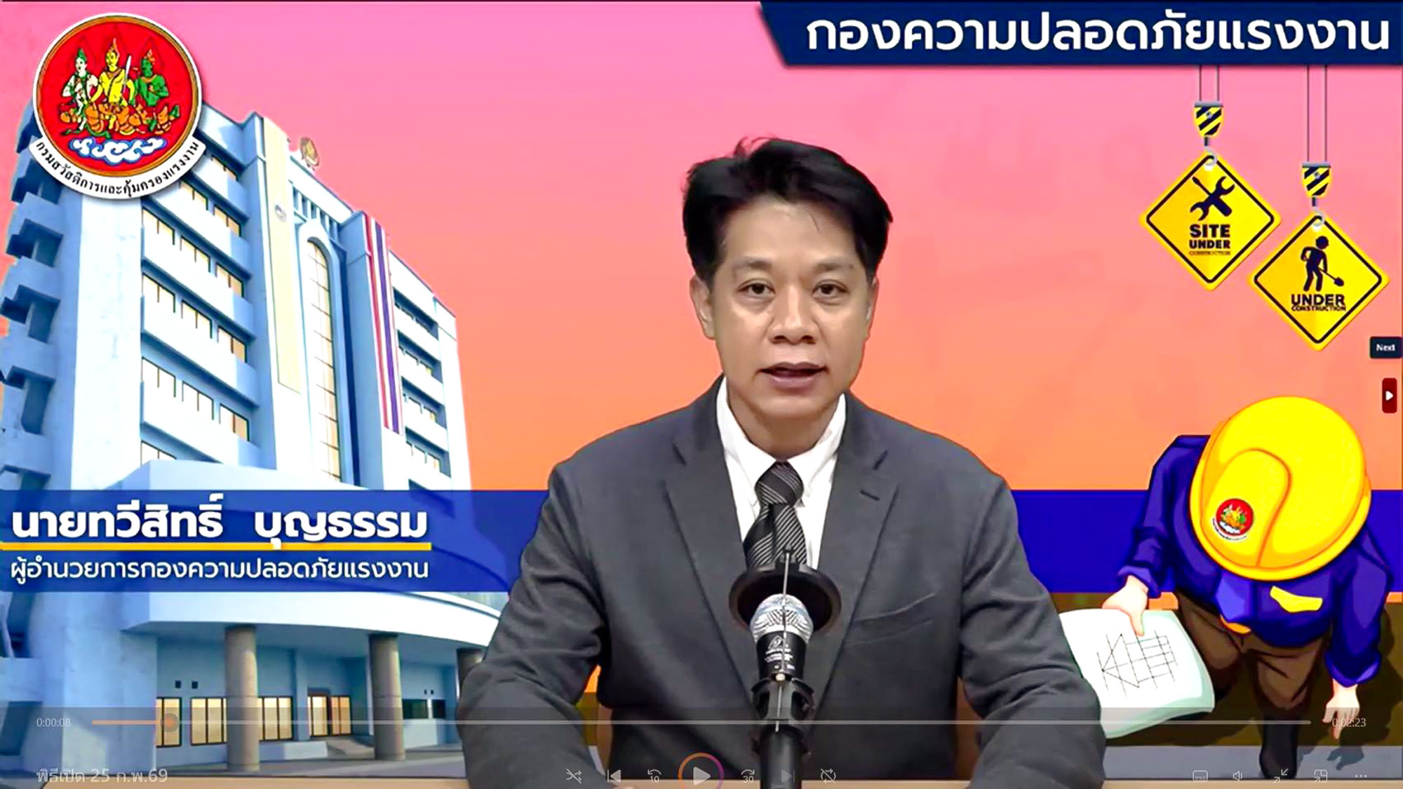 วันพุธที่ ๒๕ กุมภาพันธ์ ๒๕๖๙ เวลา ๐๘.๔๕ น. นายทวีสิทธิ์ บุญธรรม ผู้อำนวยการกองความปลอดภัยแรงงาน กล่าวเปิดการอบรม “Osh 2 ทบทวนกฎหมายความปลอดภัยฯ” สำหรับนายจ้าง ลูกจ้าง และประชาชนทั่วไป ตามแผนปฏิบัติงาน ประจำปีงบประมาณ พ.ศ. ๒๕๖๙ ผ่านระบบวีดิทัศน์ทางไกล ณ ห้องถ่ายทอดสัญญาณ ชั้น ๕ กองความปลอดภัยแรงงาน อาคารกรมสวัสดิการและคุ้มครองแรงงาน (ส่วนแยกตลิ่งชัน) โดยมี นายสมเกียรติ แสงเพิ่ม ผู้อำนวยการศูนย์ความปลอดภัยในการทำงานเขต ๒ (ชลบุรี) กล่าวรายงานวัตถุประสงค์ จัดโดยศูนย์ความปลอดภัยในการทำงานเขต ๒ (ชลบุรี) มีวัตถุประสงค์เพื่อผู้เข้ารับการอบรมสามารถปฏิบัติตามกฎกระทรวงฯ การป้องกันและระงับอัคคีภัย พ.ศ. ๒๕๕๕ และแนวทางการปฏิบัติเมื่อเกิดเหตุอัคคีภัยในสถานประกอบการ รวมไปถึงการจัดทำระบบการจัดการความปลอดภัยตามกฎกระทรวงฯ ระบบการจัดการด้านความปลอดภัย พ.ศ. ๒๕๖๕ ที่จะเป็นกรอบและแนวทางในการดำเนินงานด้านความปลอดภัยในสถานประกอบการ