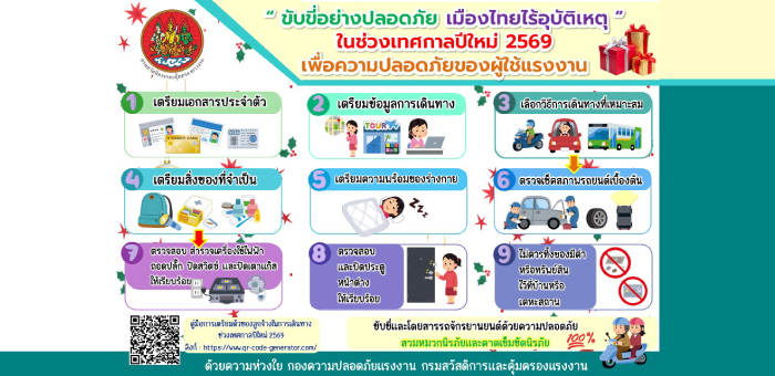 ประชาสัมพันธ์ การรณรงค์ “ขับขี่ปลอดภัย เมืองไทยไร้อุบัติเหตุ” ช่วงเทศกาลปีใหม่ ๒๕๖๙ เพื่อความปลอดภัยของผู้ใช้แรงงาน