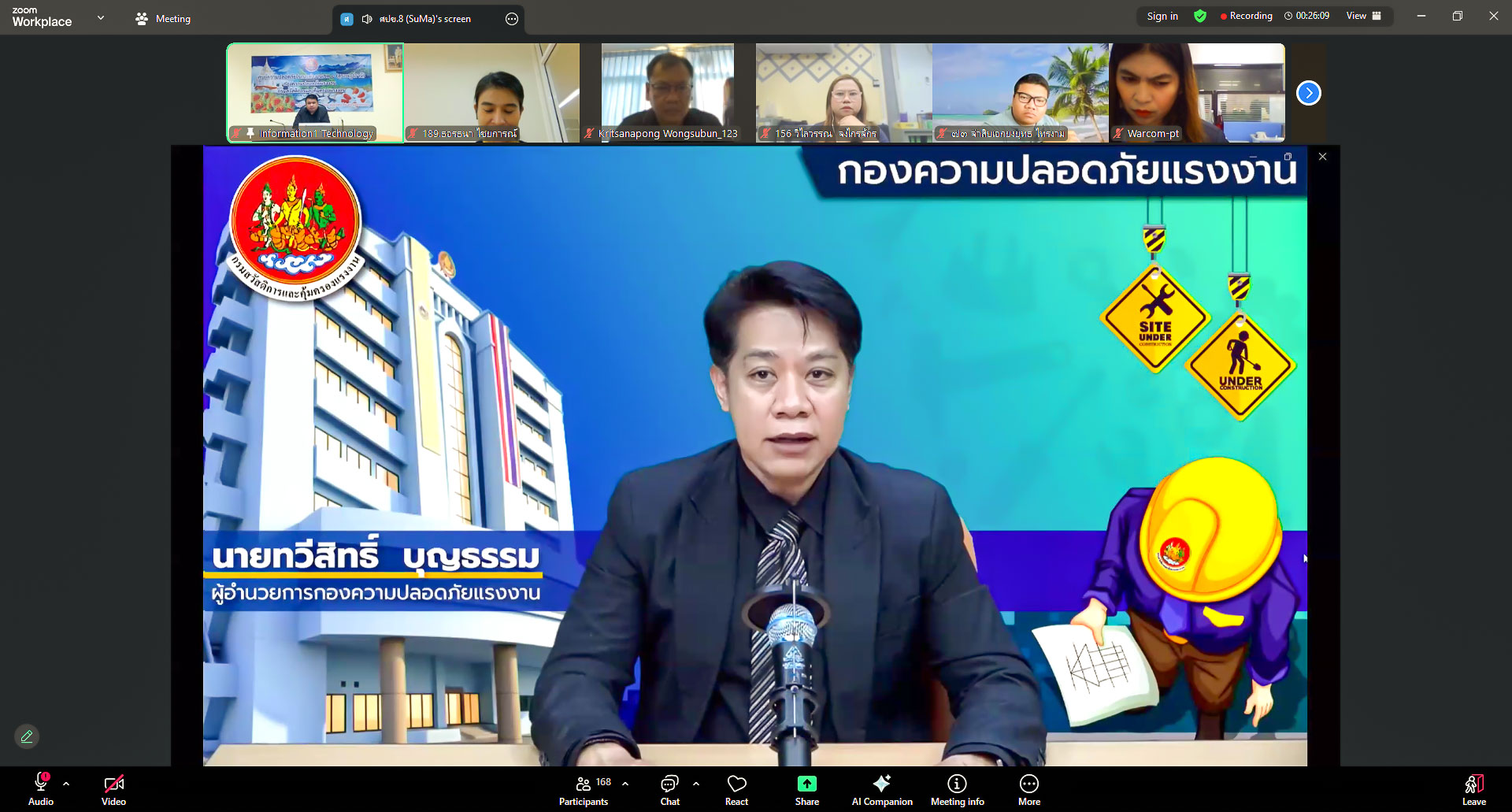 วันพุธที่ ๑๑ กุมภาพันธ์ ๒๕๖๙ เวลา ๐๘.๔๕ น. นายทวีสิทธิ์ บุญธรรม ผู้อำนวยการกองความปลอดภัยแรงงาน เป็นประธานเปิดการอบรมโครงการประชุมชี้แจงกฎหมาย แนวปฏิบัติ และมาตรการเชิงป้องกันด้านความปลอดภัยฯ สำหรับนายจ้าง ลูกจ้าง และประชาชนทั่วไป ประจำปีงบประมาณ พ.ศ. ๒๕๖๙ ผ่านระบบวีดิทัศน์ทางไกล จัดโดยศูนย์ความปลอดภัยในการทำงานเขต ๘ (สุราษฎร์ธานี) มีผู้เข้าร่วมโครงการ ๑๕๐ คน มีวัตถุประสงค์เพื่อส่งเสริมและพัฒนาองค์ความรู้เกี่ยวกับกฎหมาย แนวปฏิบัติ มาตรการเชิงป้องกันด้านความปลอดภัยเป็นการสร้างความตระหนักและสร้างจิตสำนึกด้านความปลอดภัย รวมทั้งสร้างเสริมให้เกิดเป็นวัฒนธรรมความปลอดภัยให้แก่ผู้ใช้แรงงานทุกภาคส่วน