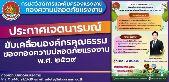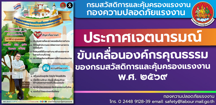 ประกาศเจตนารมณ์ขับเคลื่อนองค์กรคุณธรรมของกองความปลอดภัยแรงงาน ประจำปีงบประมาณ พ.ศ. ๒๕๖๙