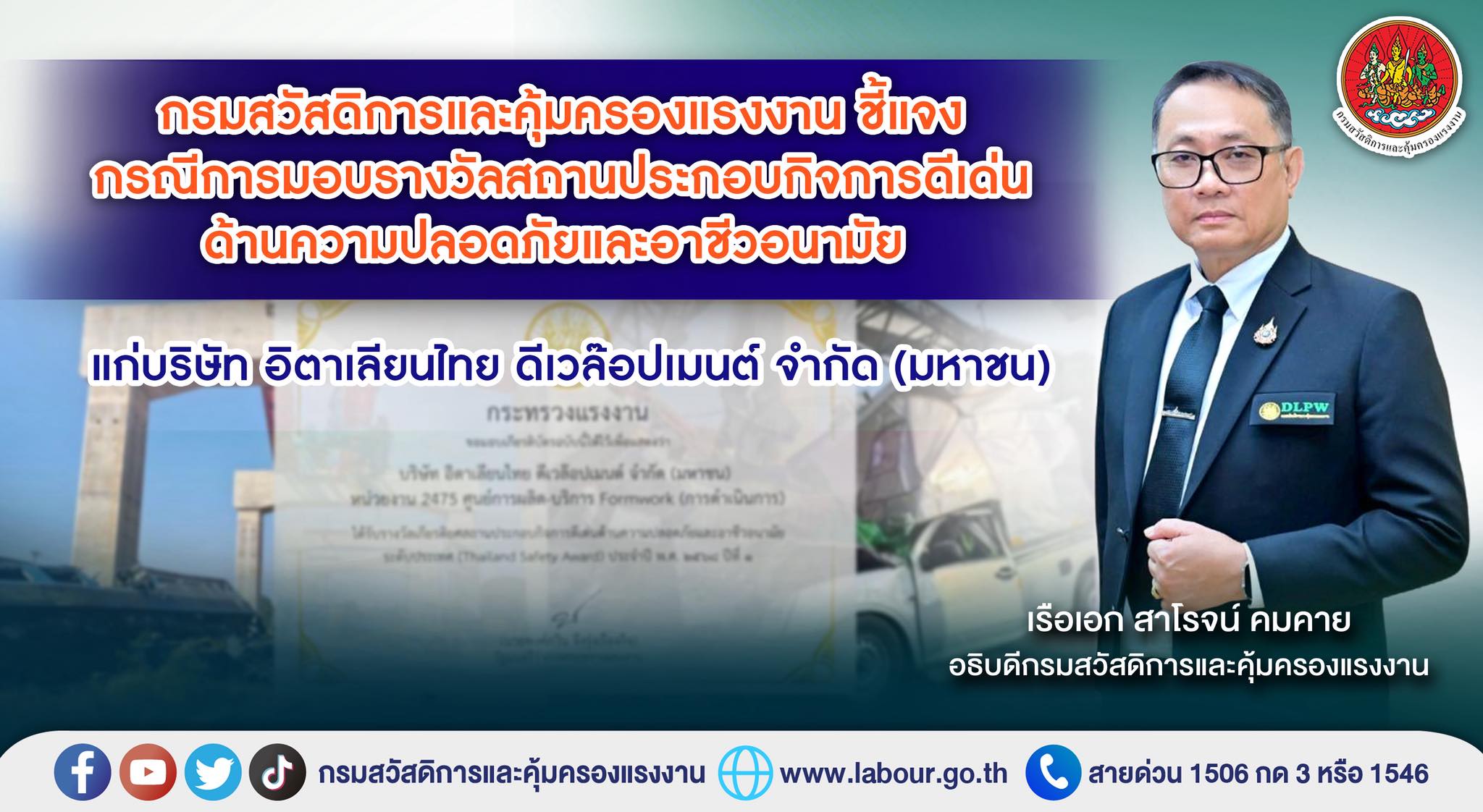 กรมสวัสดิการและคุ้มครองแรงงาน ชี้แจงกรณีการมอบรางวัลสถานประกอบกิจการดีเด่นด้านความปลอดภัยและอาชีวอนามัย แก่บริษัท อิตาเลียนไทย ดีเวล๊อปเมนต์ จำกัด (มหาชน)