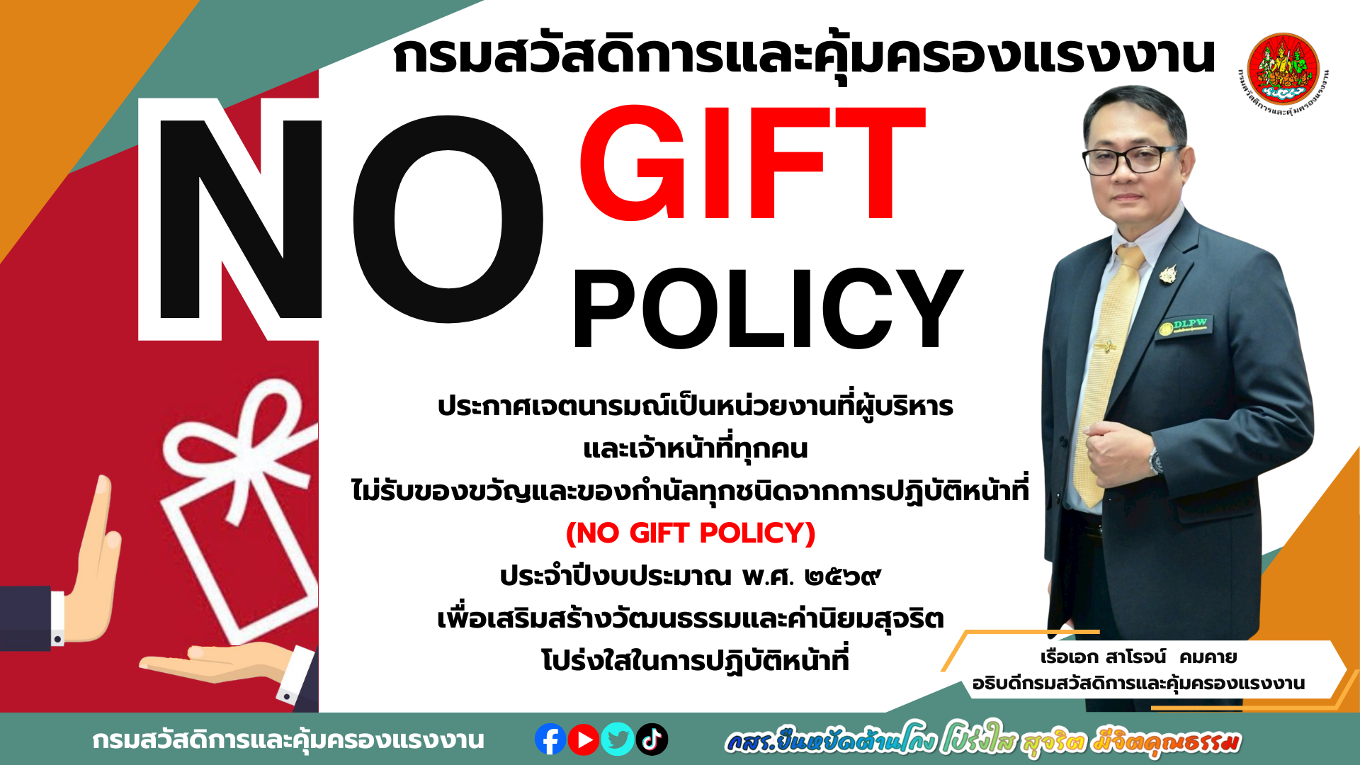 ประกาศเจตนารมณ์เป็นหน่วยงานที่ผู้บริหารและเจ้าหน้าที่ทุกคนไม่รับของขวัญและของกำนัลทุกชนิดจากการปฏิบัติหน้าที่ (NO GIFT POLICY) ประจำปีงบประมาณ พ.ศ. ๒๕๖๙