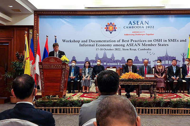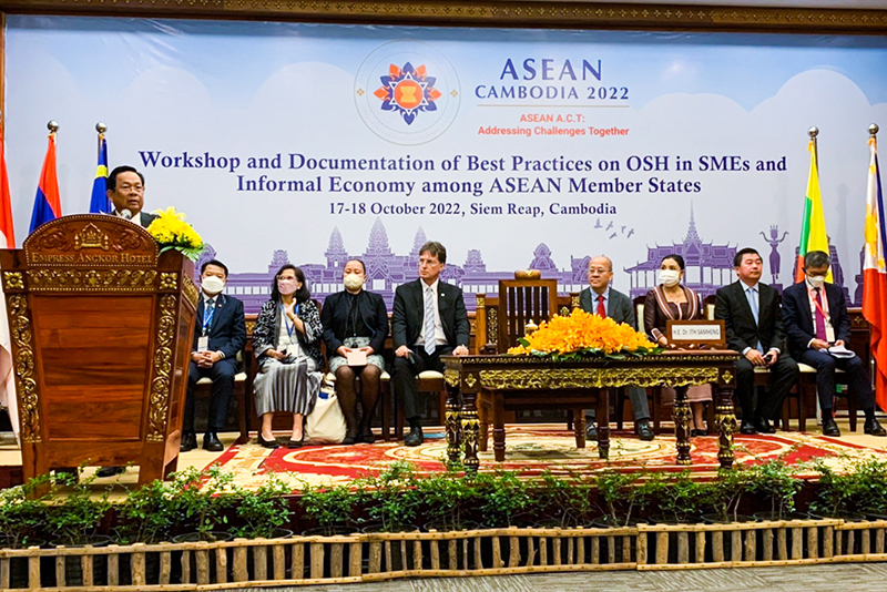 The Ministry of Labour and Vocational Training of Cambodia with technical assistance from the ILO hosted the Workshop and Documentation of Best Practices on Occupational Safety and Health (OSH) in SMEs and Informal Economy among ASEAN Member States on 17-18 October 2022. The workshop was attended by all ASEAN Member States (AMS), ASEAN +3 Countries, ASEAN Secretariat, ASEAN-OSHNET Secretariat, Representative from ASEAN Trade Union Council (ATUC), ASEAN Confederation of Employers (ACE) and International Organization.